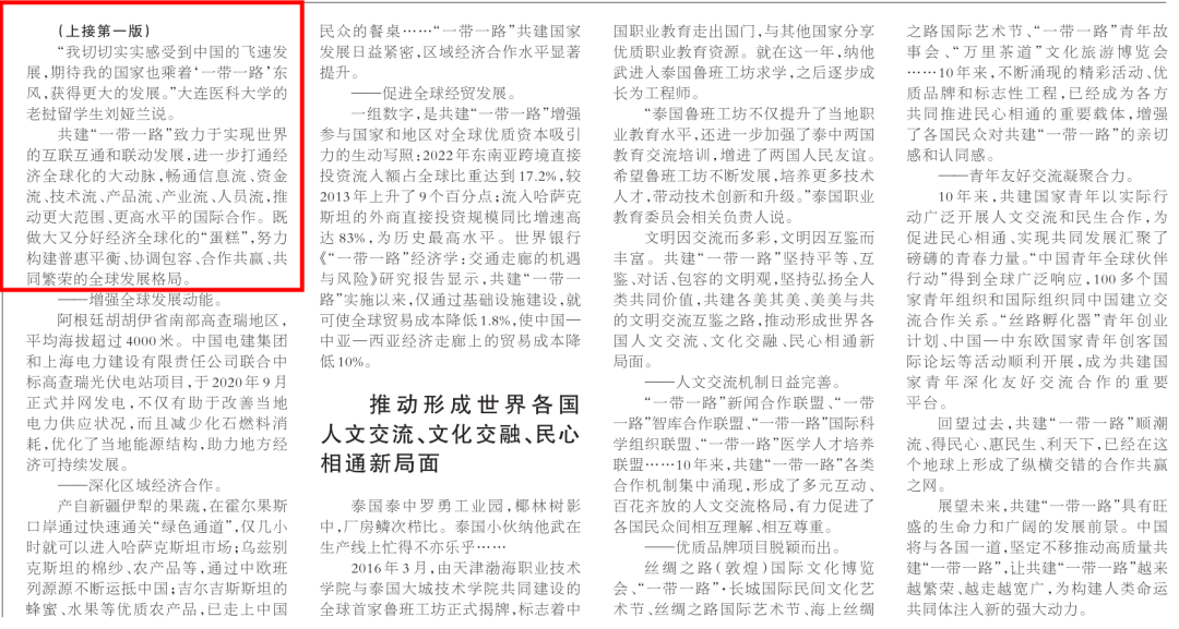 2019级临床医学1班的老挝籍留学生刘娅兰(Vilayphone Vidalack),他们切身感受到了中国的跨越式发展为其他国家民众带来的便利和发展契机。在《人民日报》10月12日头版题为《高质量共建“一带一路”行稳致远》的报道中,她讲道:“我切切实实感受到中国的飞速发展,期待我的国家也乘着‘一带一路’东风,获得更大的发展。”