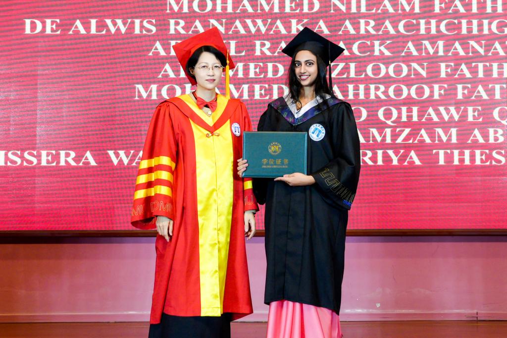 随后,院长卢苇宣读《2024届冬季国际学生学位授予决定》,校长刘莹分别为博士研究生、硕士研究生、本科毕业生拨穗并颁发毕业证书。