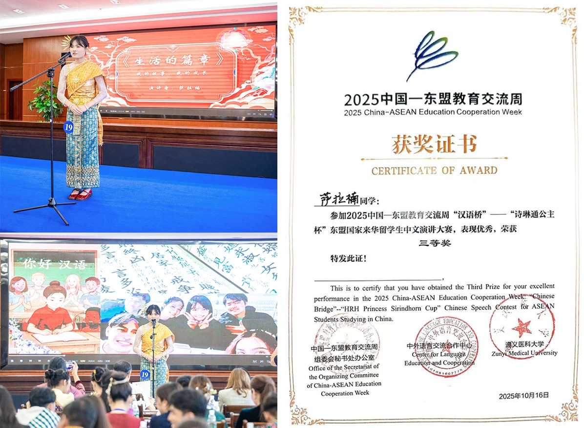 2024级泰国籍留学生萨拉楠凭借出色表现成功入围交流周“汉语桥”—“诗琳通公主杯”东盟国家来华留学生中文演讲大赛决赛并荣获三等奖,其指导教师闫晓松获颁“优秀指导教师奖”。