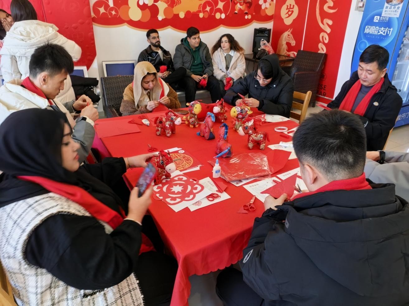 剪纸桌前同样热闹非凡。辅导员老师现场展示剪纸技艺,来自伊朗的留学生法赫拉拿着自己剪好的“窗花”兴奋地说:“中国剪纸太神奇了,不用画笔,只用剪刀就能做出这么漂亮的图案,我要把它带回宿舍贴在窗户上!”指尖的巧思,将异国学子的心意与中国民俗文化紧紧相连。