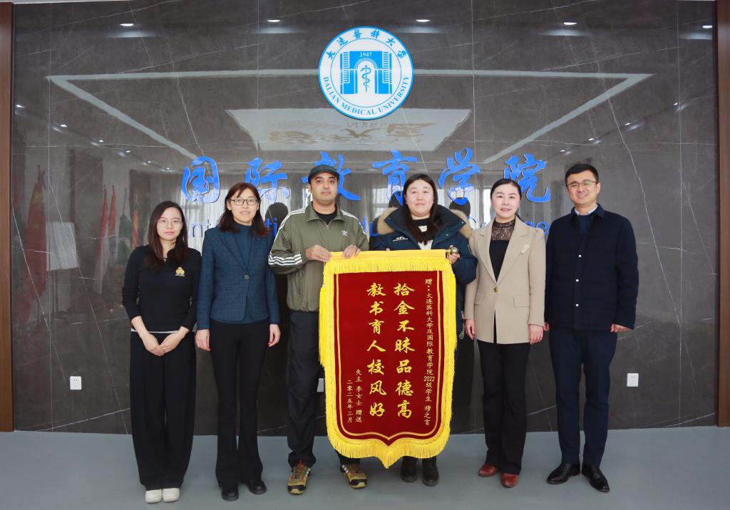 为了表达对穆之言以及学校的感激之情,失主刘女士通过半岛晨报记者求助,与我院老师取得联系,并定制了一面锦旗送到学院,上面写着 “拾金不昧品德高 教书育人校风好”。刘女士表示,这面锦旗不仅是对穆之言个人高尚品德的赞扬,更是对学校良好教育氛围和校风的高度认可。她感慨道,在这所学校里,无论是中国学生还是留学生,都展现出了极高的道德素养,这与学校的悉心培育密不可分。